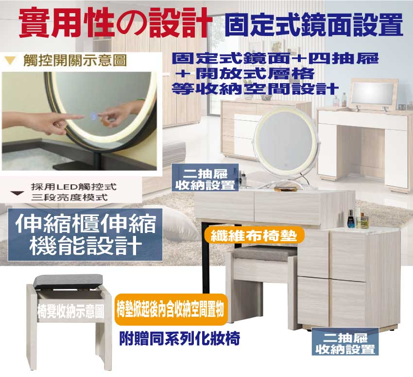 鏡台櫃身寬度可伸縮80-110公分調整使用搭配可掀蓋收納化妝椅凳,滿足您居家空間使用便利性