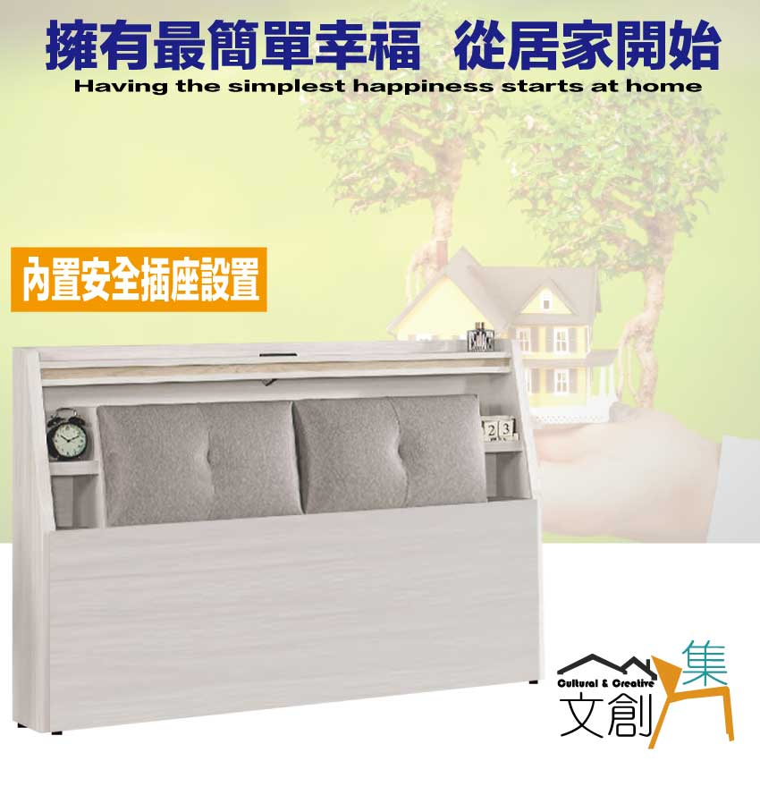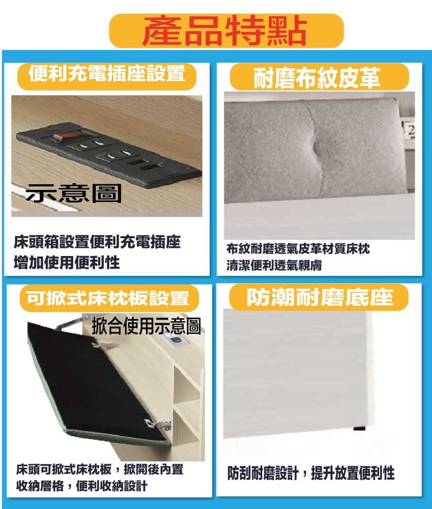 搭配床頭箱可掀式床枕板+內&外收納層格+便利插座設置等收納空間設計