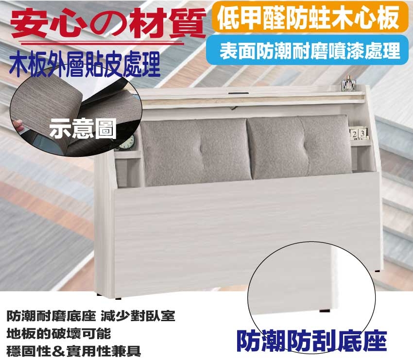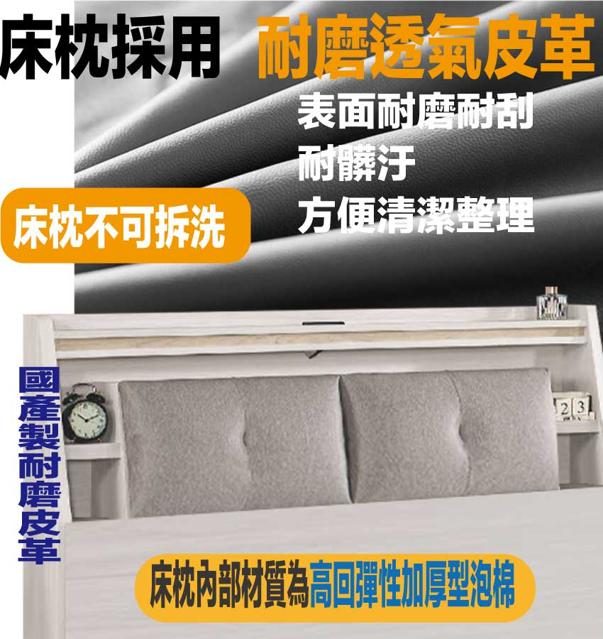 材質:防蛀木心板+防潮耐磨底座+耐磨耐刮皮革+高回彈泡棉