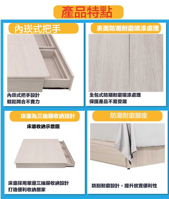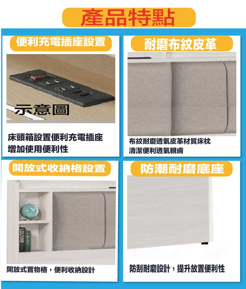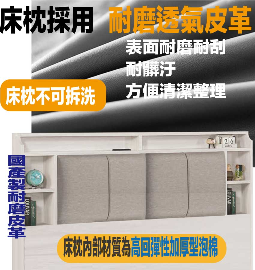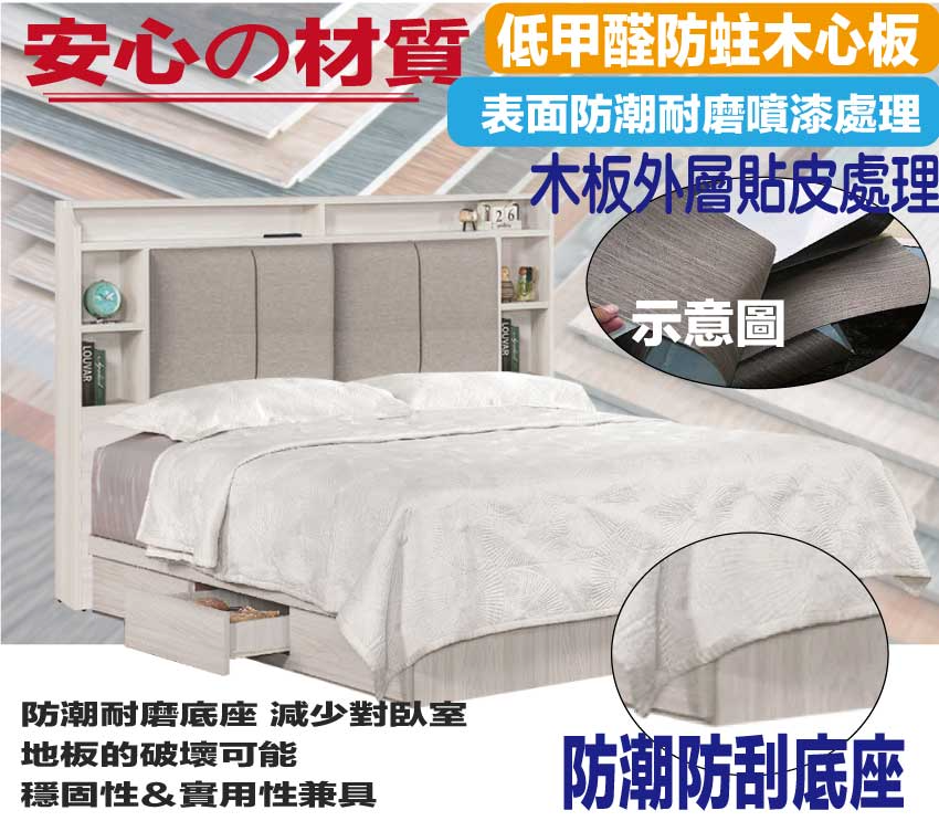 材質:防蛀木心板+六分木床板+防潮耐磨底座+耐磨耐刮皮革+高回彈泡棉