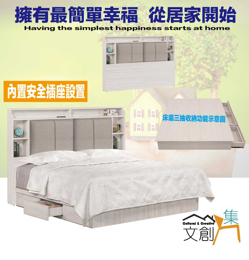 搭配開放層格+便利插座設置+床底座單邊開合三抽屜等收納空間設計