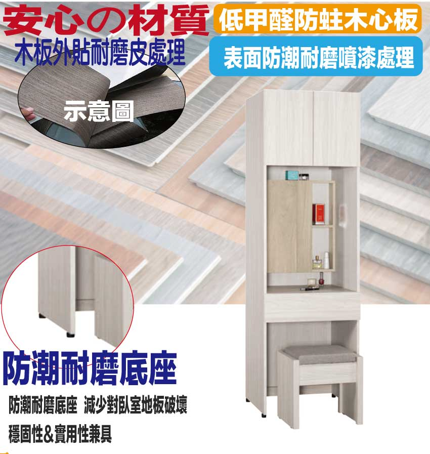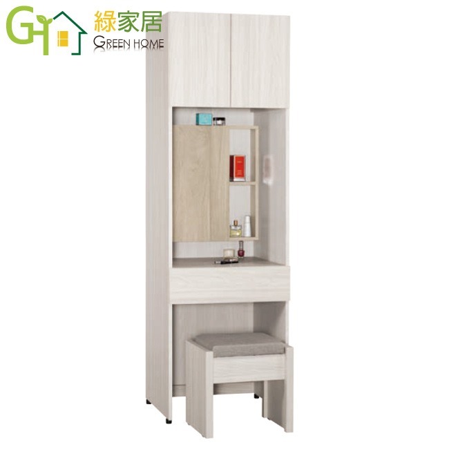 【綠家居】寶亞2尺開合鏡面衣櫃式鏡台/化妝台組合(含化妝椅) 木紋雙色系+安心材質製造,使用放心+搭配居家更便利,採用防蛀木心板+防潮耐磨底座+五金滑軌結構+強化玻璃鏡面+防夾手緩衝門片五金等安心材質製造 ,外層採用防潮耐磨噴漆處理搭配採用開合鏡面櫃+開門櫃+單抽屜+內&外開放層格等收納空間設計,全由專人配送到家,專業安心服務,替你省下更多時間!