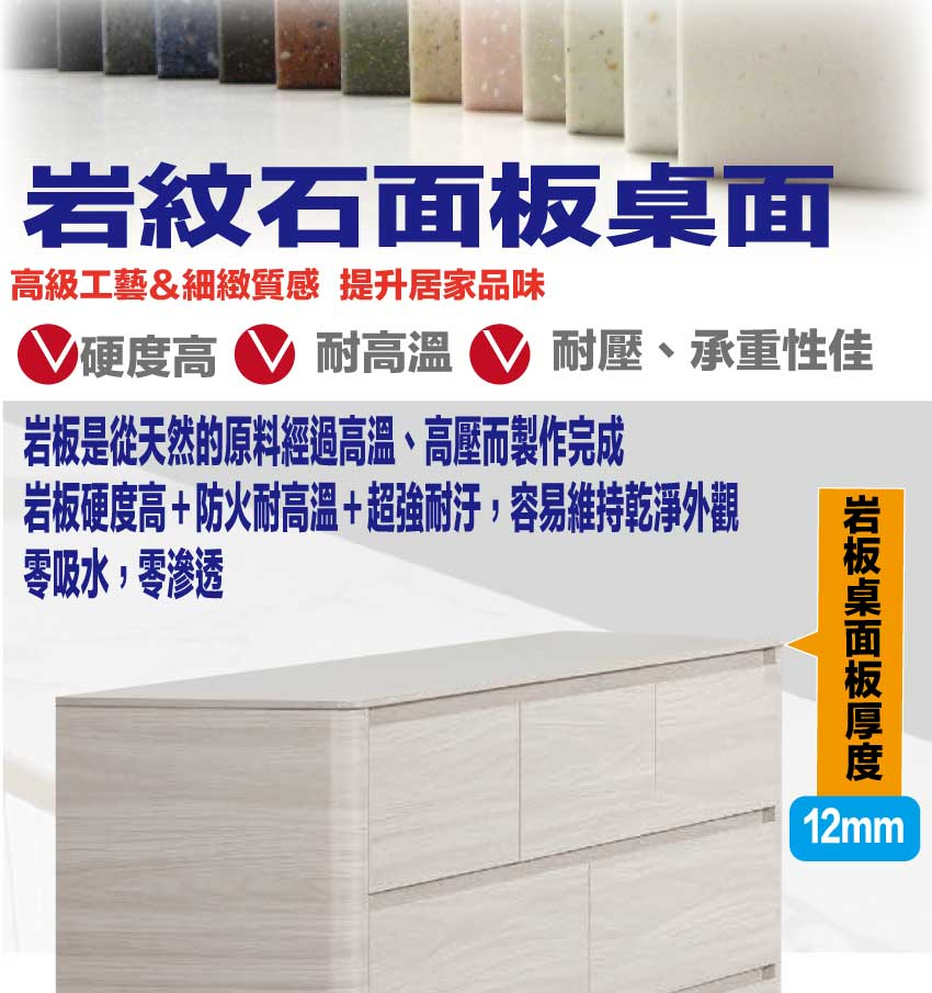 材質:防蛀木心板+實木耐磨腳座+五金滑軌結構+12mm高硬度岩板桌面板