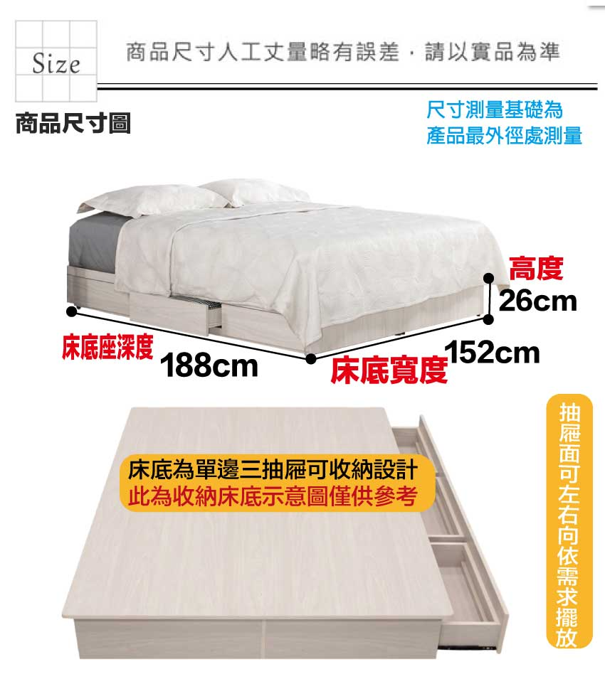 - ◆產品名稱:【綠家居】華爾5尺雙人單邊三抽床底座(不含床墊)