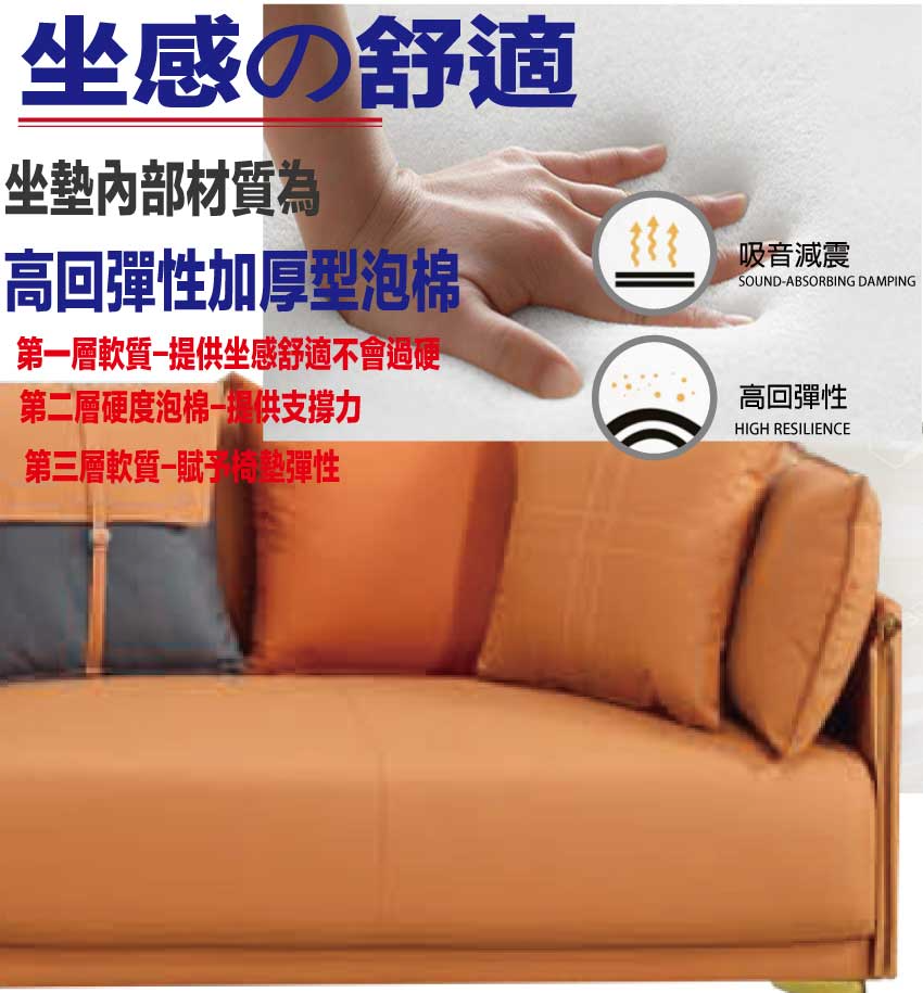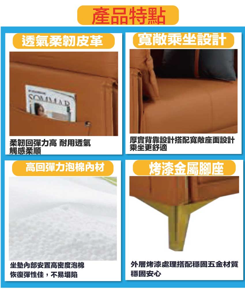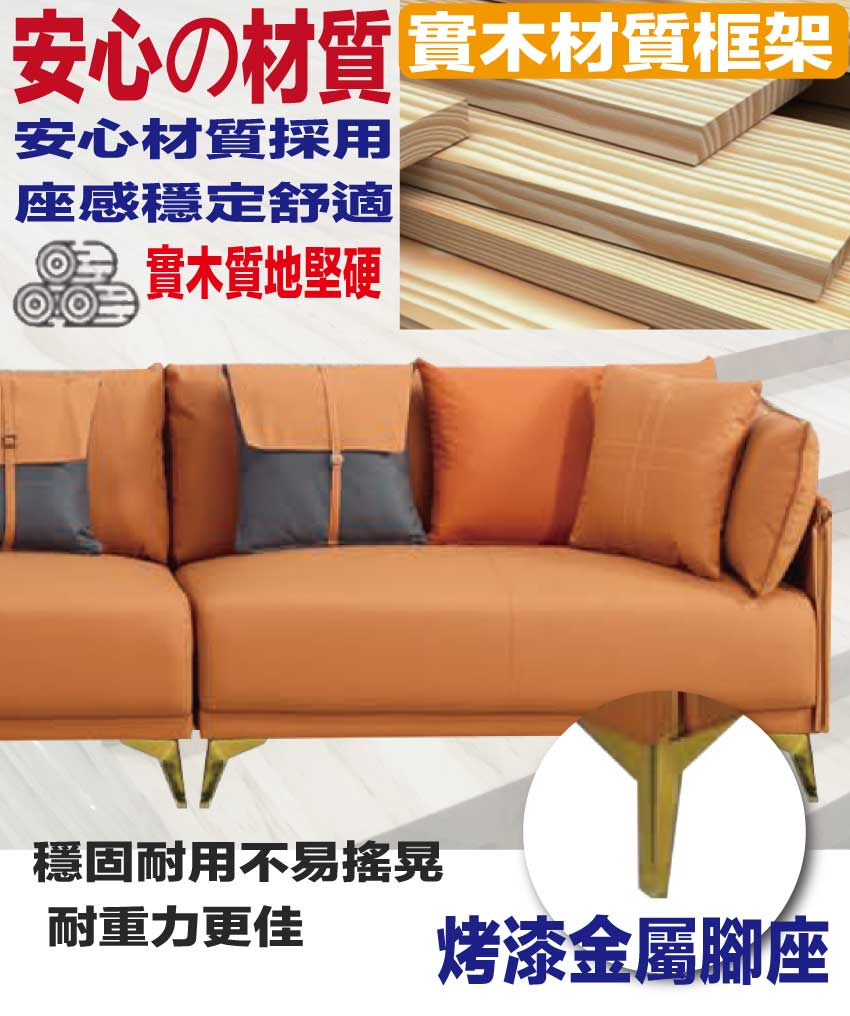 採用內部實木板材框架+烤漆金屬腳座+透氣柔韌皮革+高回彈力加厚泡棉等安心材質製造