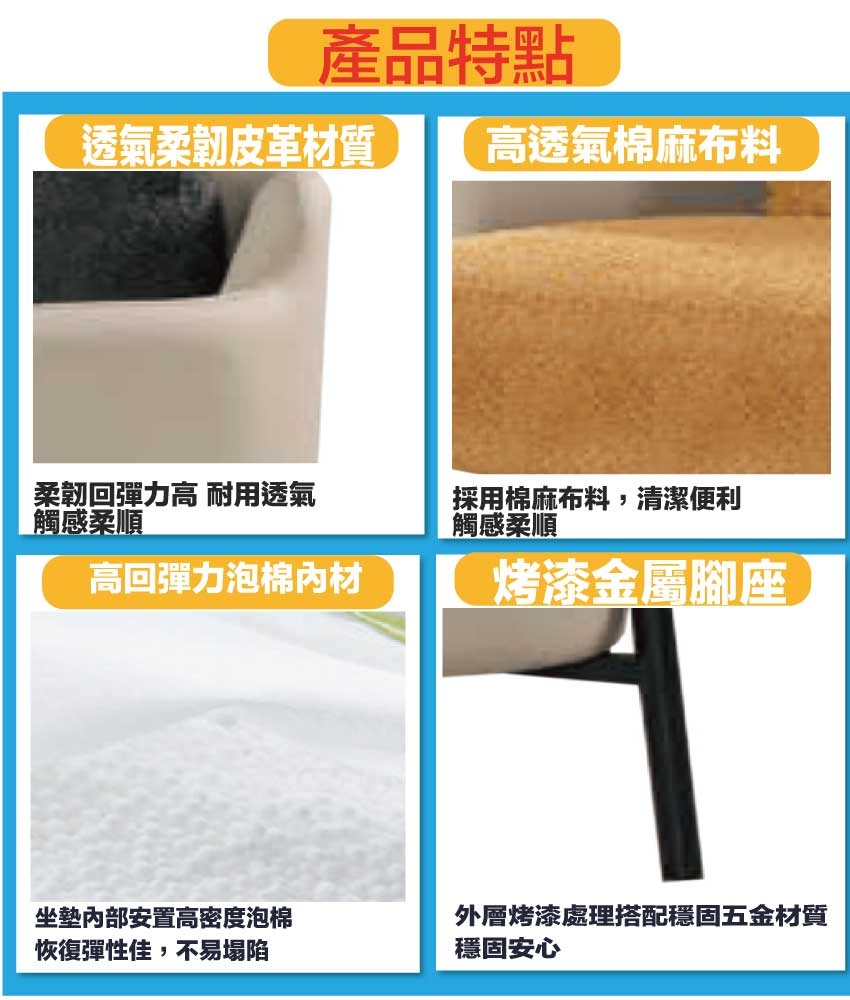 採用內部實木板材框架+烤漆金屬腳座+透氣柔韌皮革&透氣棉麻布+高回彈力加厚泡棉等安心材質製造