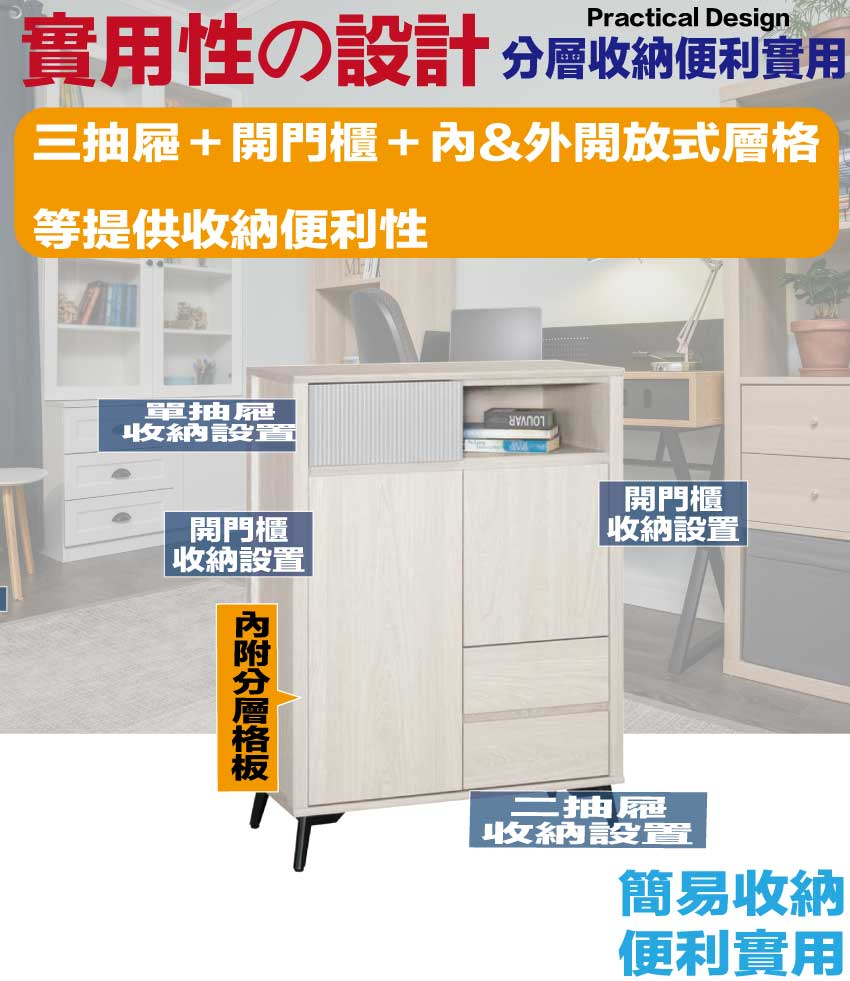 搭配採用開門櫃+二抽屜+開放層格等收納空間設計