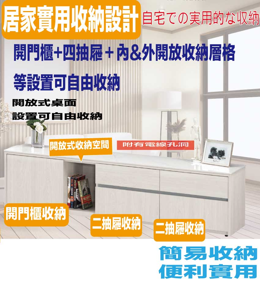 搭配採用開門櫃+四抽屜+開放層格等收納空間設計