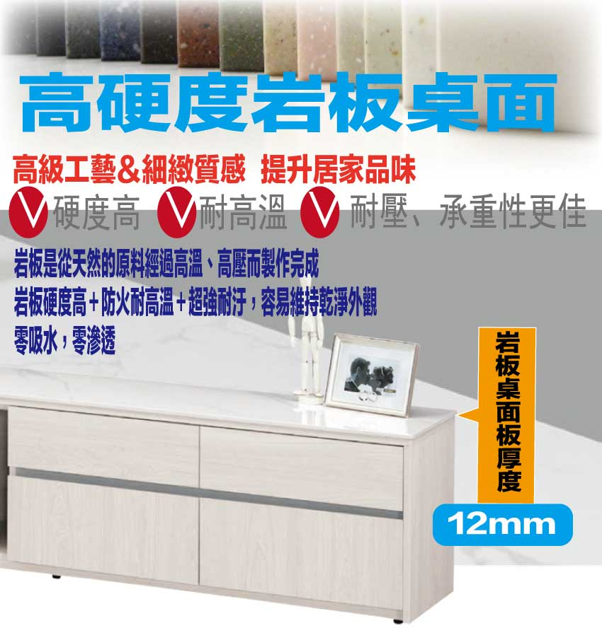 材質:防蛀木心板+防潮耐磨底座+防夾手緩衝門片五金+五金滑軌結構+12mm高硬度岩板桌面板