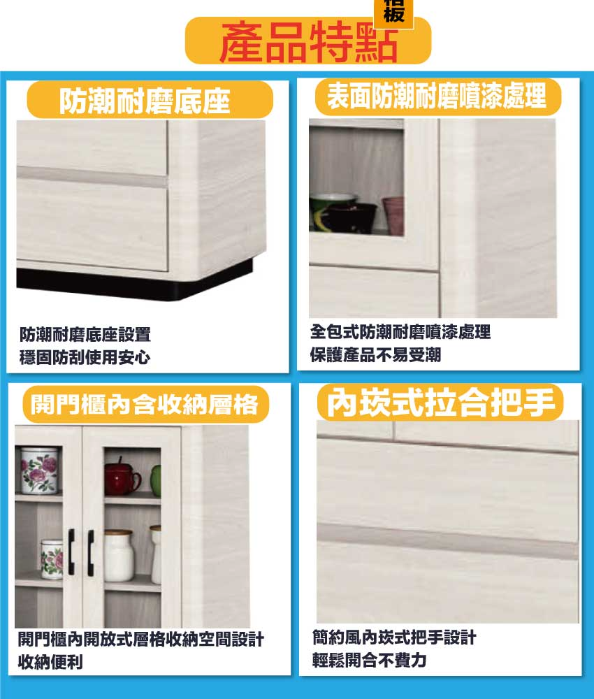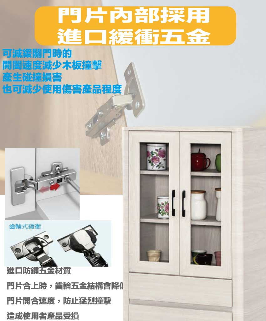 採用防蛀木心板+防潮耐磨底座+防夾手緩衝門片五金+5mm強化玻璃+五金滑軌結構等安心材質製造