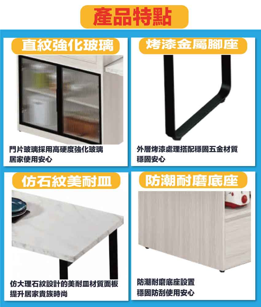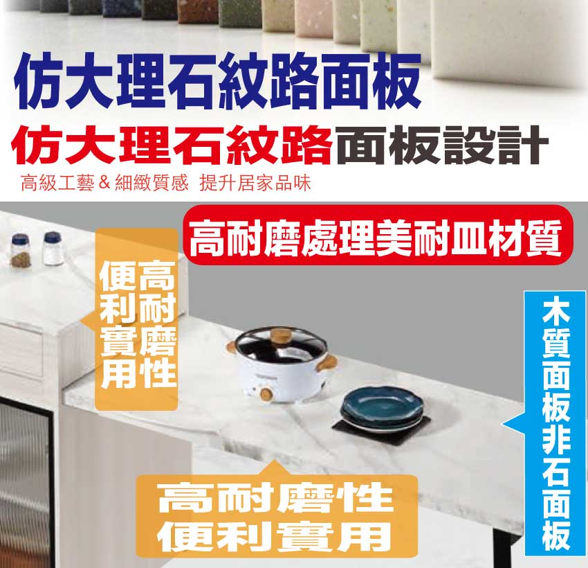 材質:防蛀木心板+防潮耐磨腳座+防夾手緩衝門片五金+仿石紋耐磨美耐皿桌面板+5mm強化直紋玻璃+五金滑軌結構