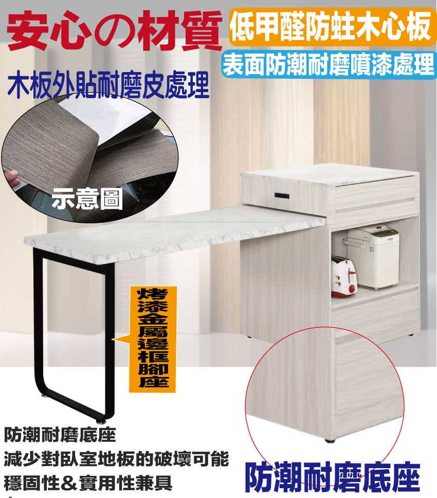 採用防蛀木心板+防潮耐磨底座+防夾手緩衝門片五金+仿石紋耐磨美耐皿桌面板+5mm強化直紋玻璃+五金滑軌結構+烤漆五金腳座等安心材質製造