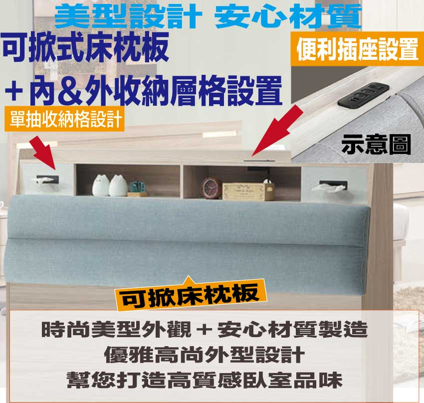 搭配床頭箱可掀式床枕板+內&外收納層格+便利插座設置等收納空間設計