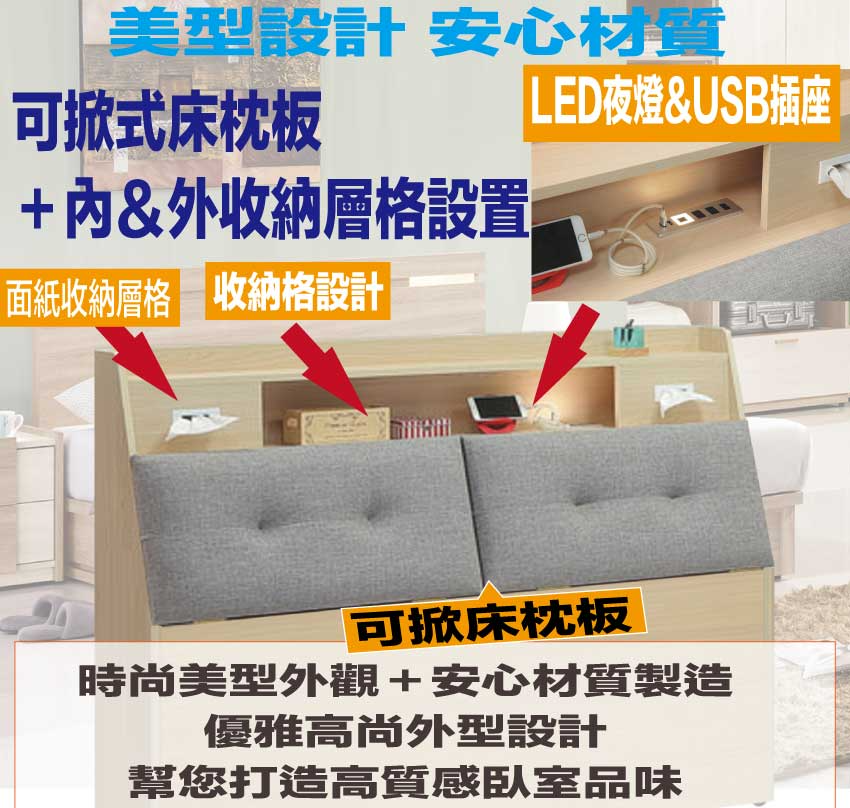 搭配床頭箱採用可掀式床枕板+內&外開放式層格+LED夜燈&USB插座等收納空間設計