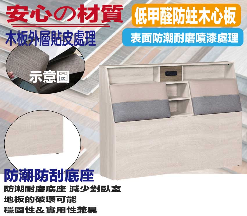 ◆材質: 材質:防蛀木心板+防潮耐磨底座+耐磨布紋皮革+高回彈泡棉