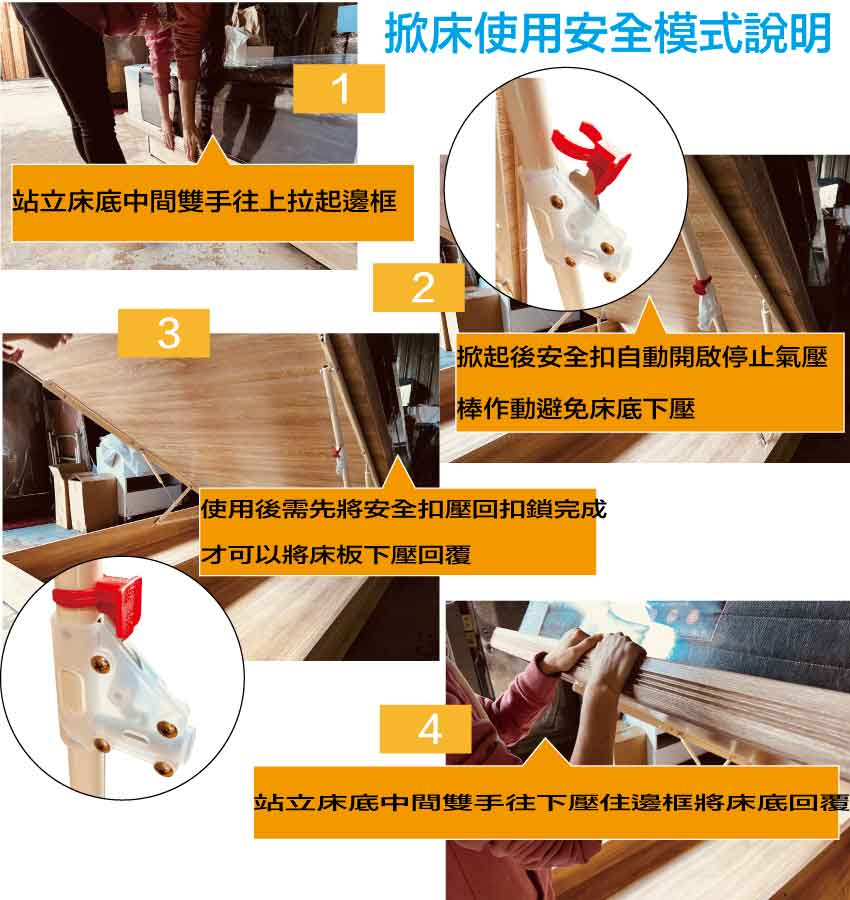 內部採用高安全係數安全扣壓機關設置(請詳閱內文圖實際使用說明),降低使用掀床的安全性疑慮