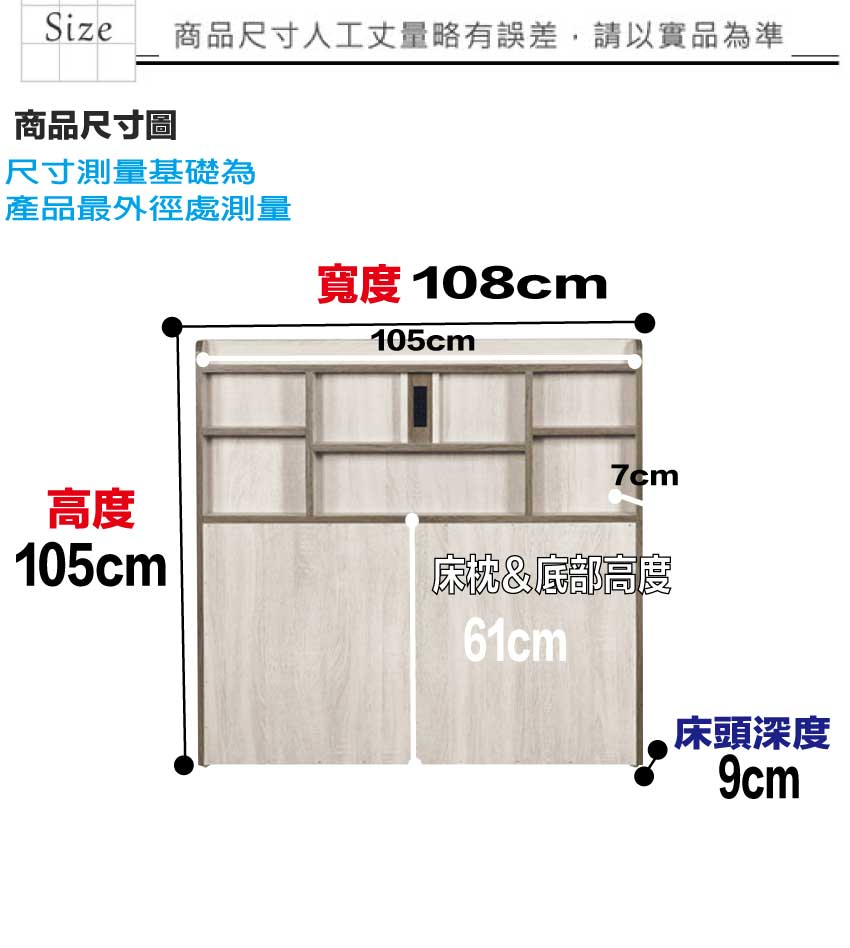 床頭尺寸:(寬)108x(深)9x(高)105/公分