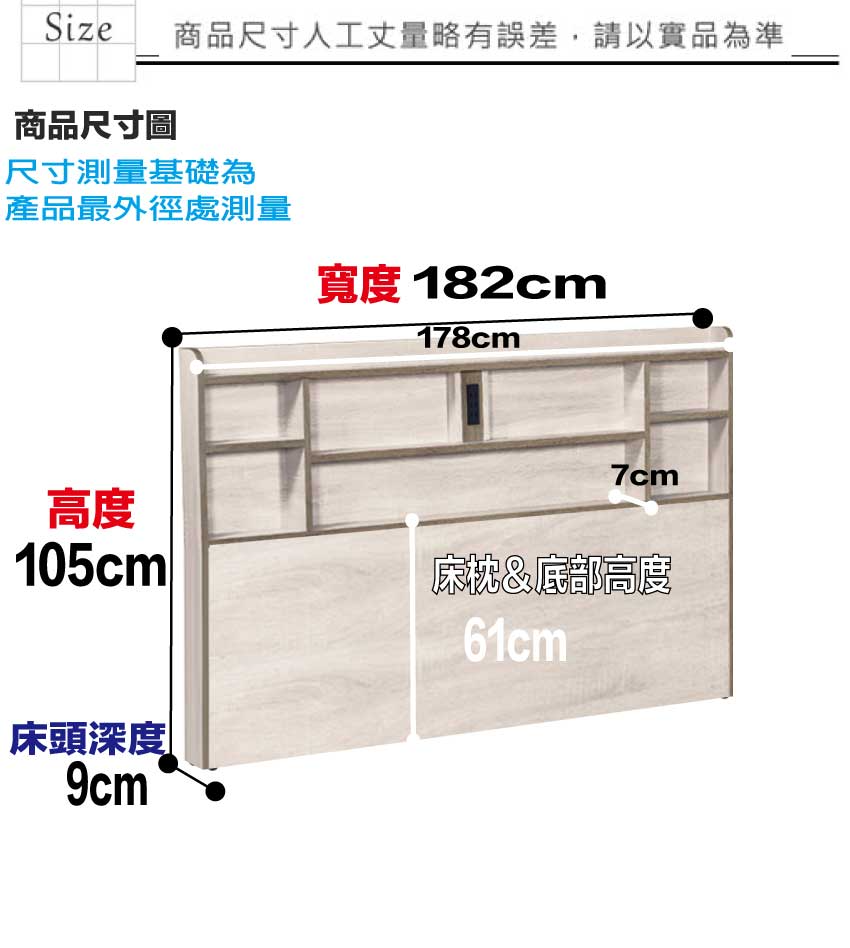 床頭尺寸:(寬)182x(深)9x(高)105/公分