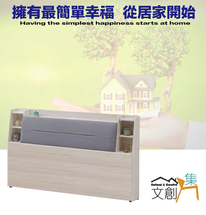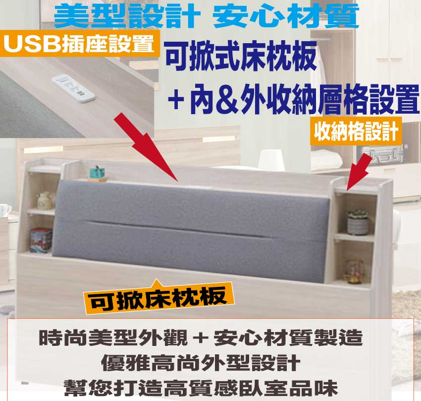 搭配床頭採用可掀式床枕板+內&外收納空間+便利插座設置等收納空間設計