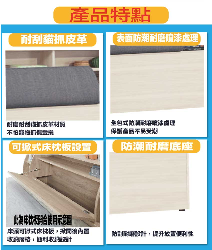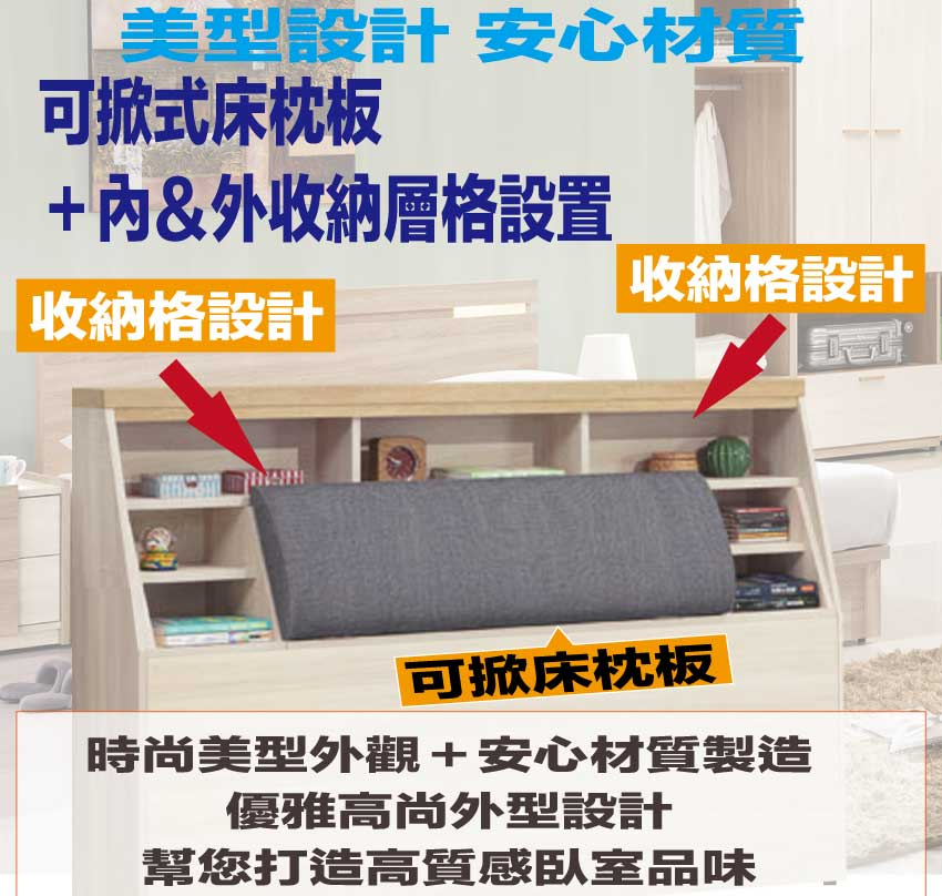 搭配床頭採用可掀式床枕板+內&外收納空間等收納空間設計