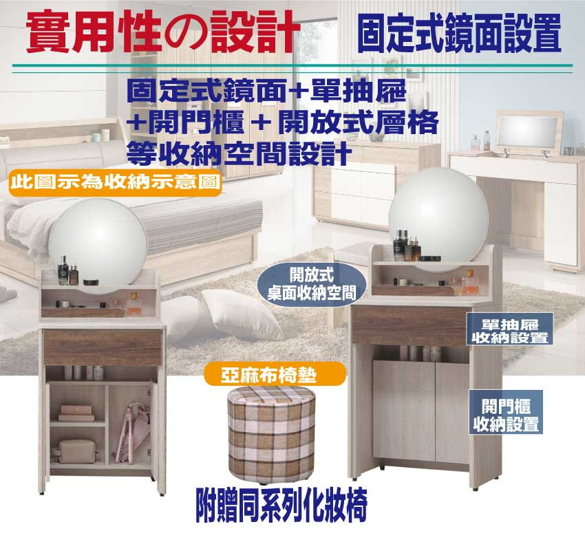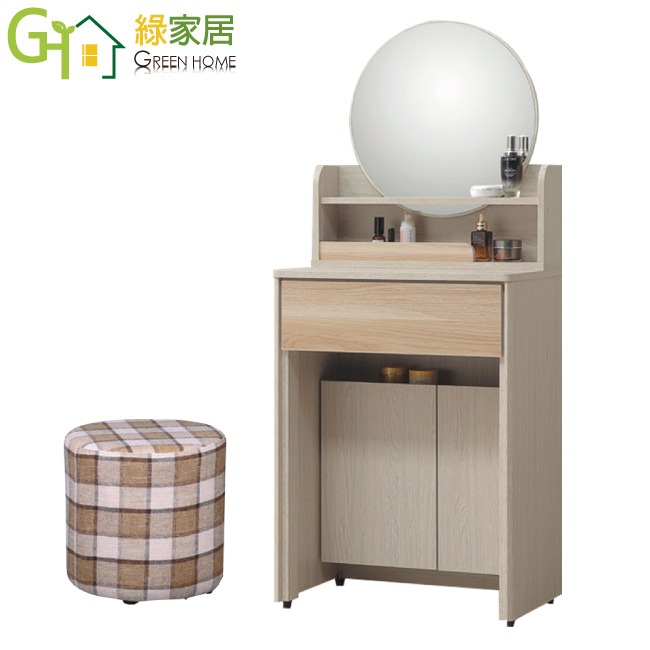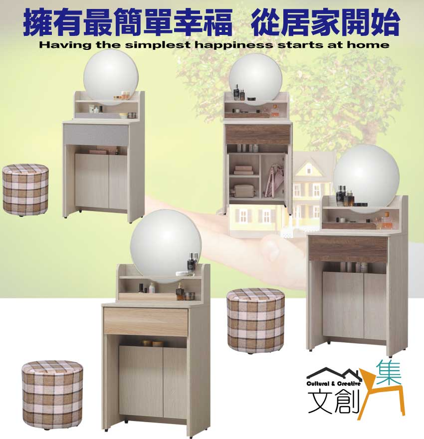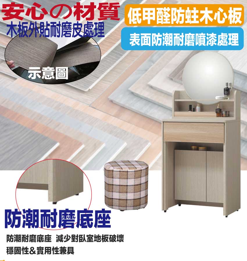 【綠家居】瑪爾2尺圓框鏡面鏡台組合(三色可選+含化妝椅) 三色可選+安心材質製造,使用放心+搭配居家更便利,採用防蛀木心板+防潮耐磨底座+強化玻璃鏡面等安心材質製造 ,外層採用防潮耐磨噴漆處理搭配採用固定式鏡面+開門櫃+單抽屜+開放層格等收納空間設計,全由專人配送到家,專業安心服務,替你省下更多時間!