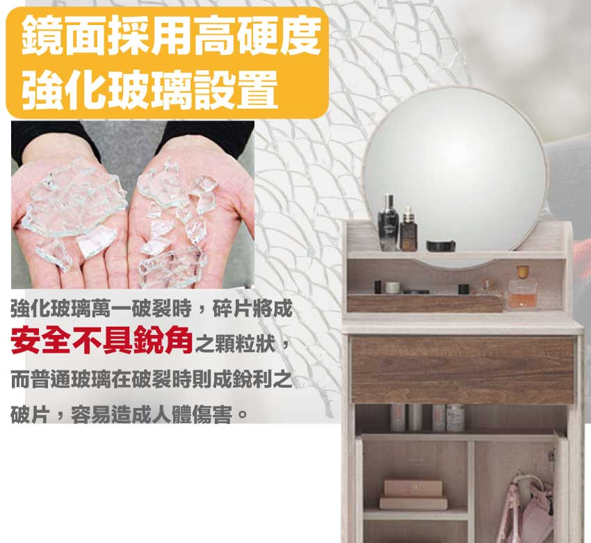 採用防蛀木心板+防潮耐磨底座+強化玻璃鏡面等安心材質製造