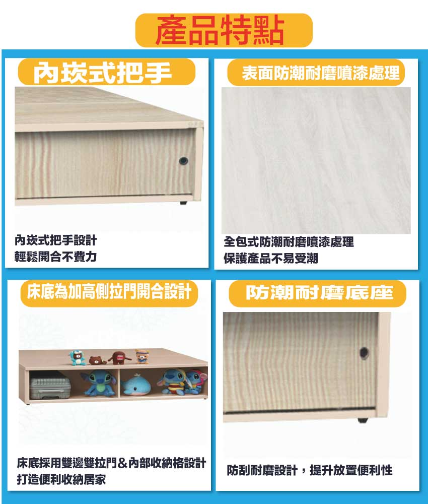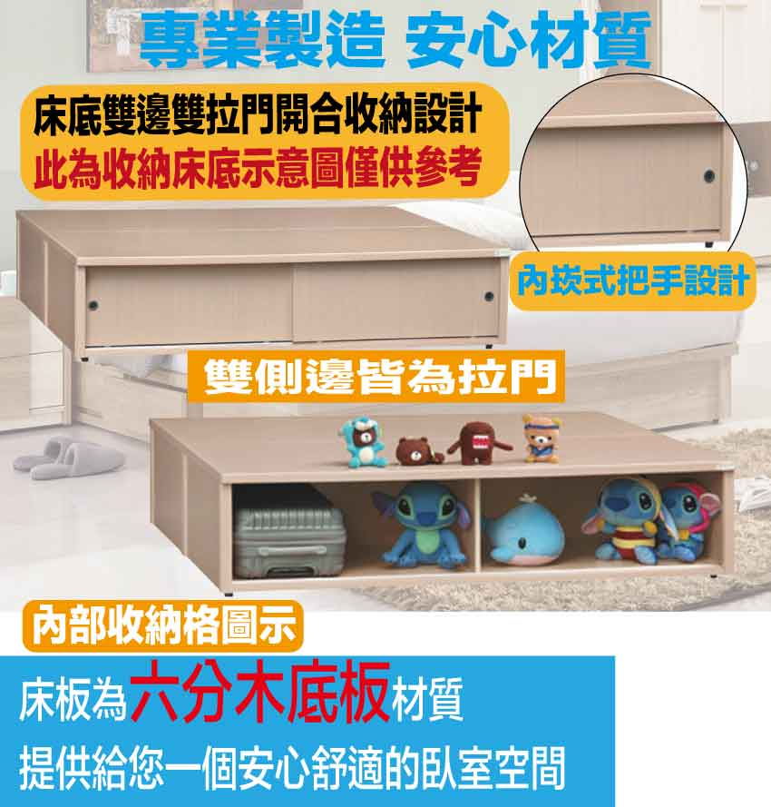 搭配床底採用雙邊拉合四拉門+內部收納層格等便利設計