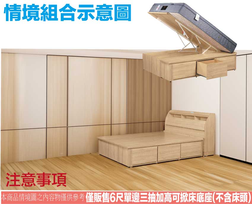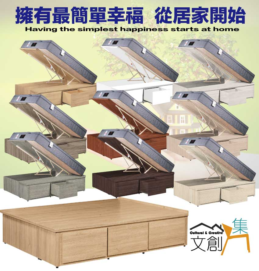 搭配採用後掀式床底板+內部收納層格設置+側邊單向三抽屜等便利機能設計