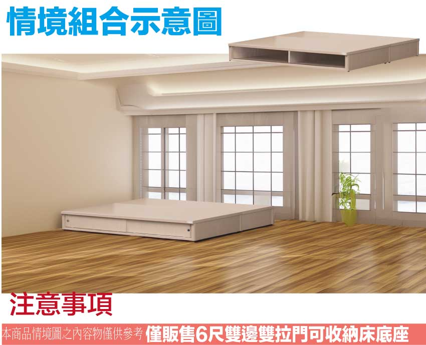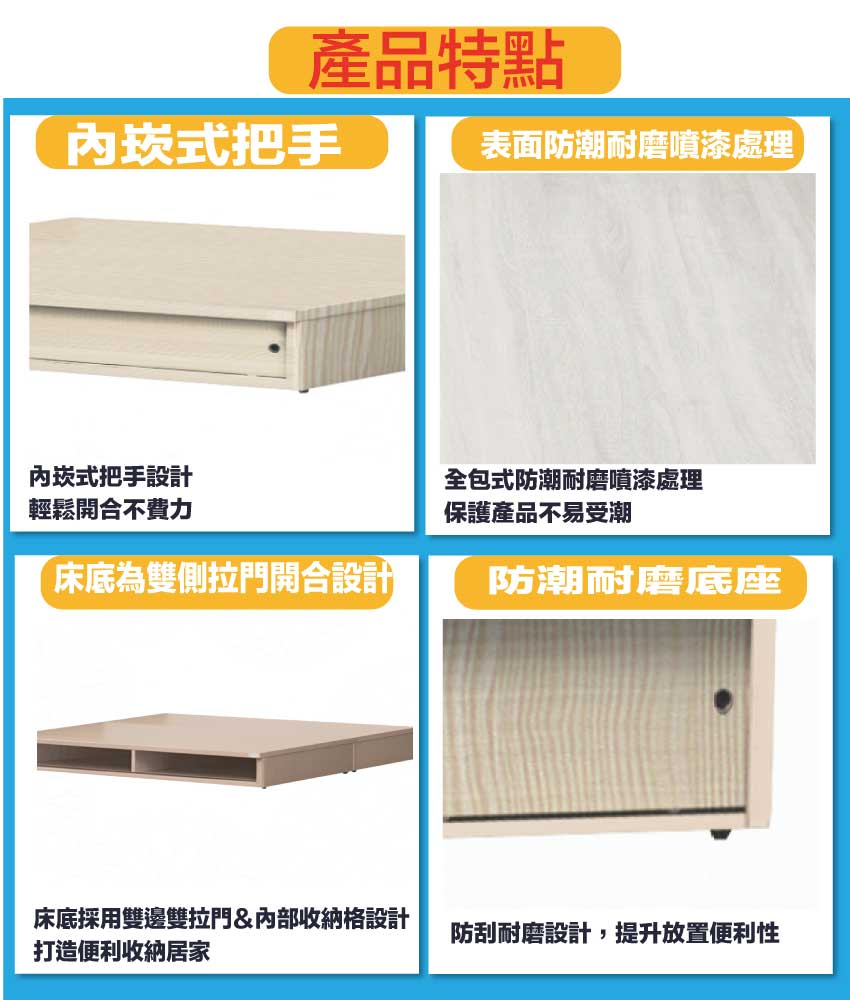 搭配床底採用雙邊拉合共四拉門+內部收納層格等便利設計