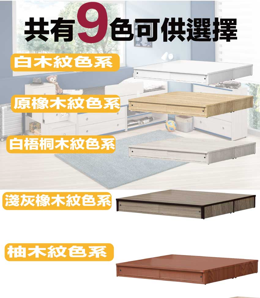 請注意 此收納床台組合搭配床頭&收納床底顏色有稍微些許色差非完全相同顏色 購買前請先確認是否能接受些微顏色差異再行購買,謝謝!