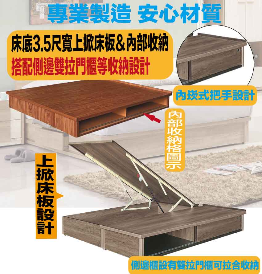 搭配採用後掀式床底板+內部收納層格設置+側邊單向雙拉門&內收納層格等便利機能設計