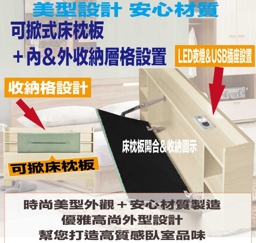 搭配床頭採用可掀式床枕板+內&外收納空間+LED夜燈&USB插座設置等收納空間設計