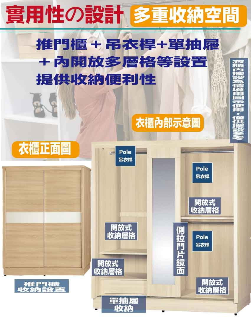 搭配採用推門櫃+吊衣桿+單抽屜+內含側拉穿衣鏡+內開放層格等收納空間設計