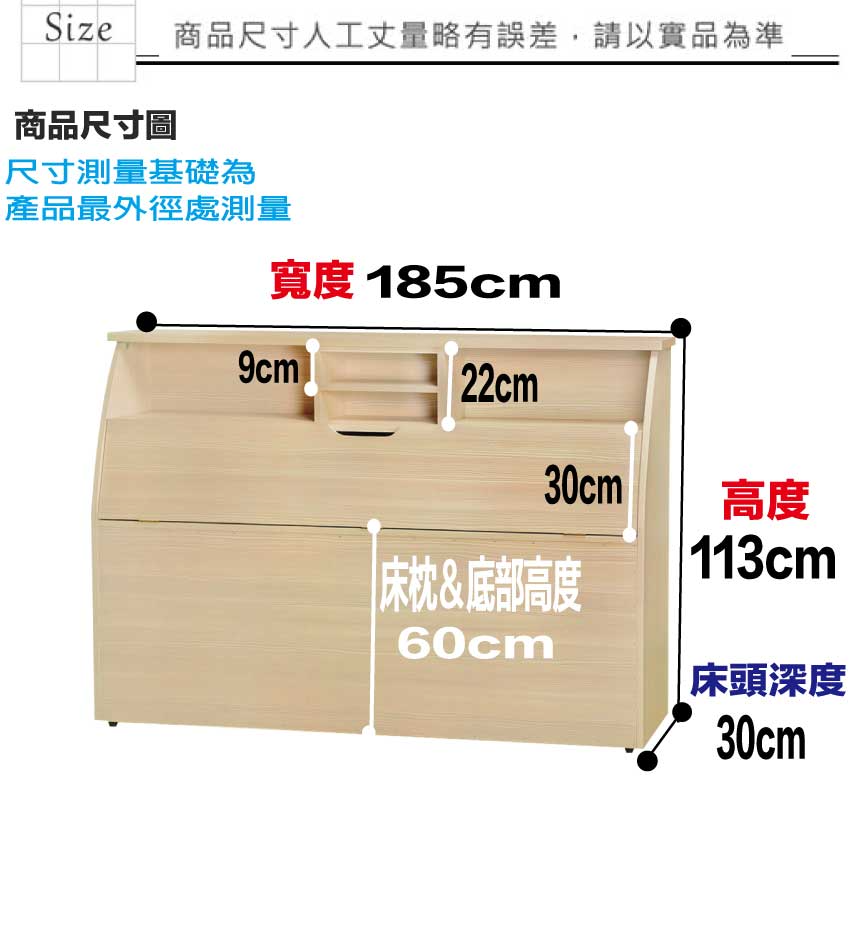 床頭尺寸:(寬)185x(深)30x(高)113/公分