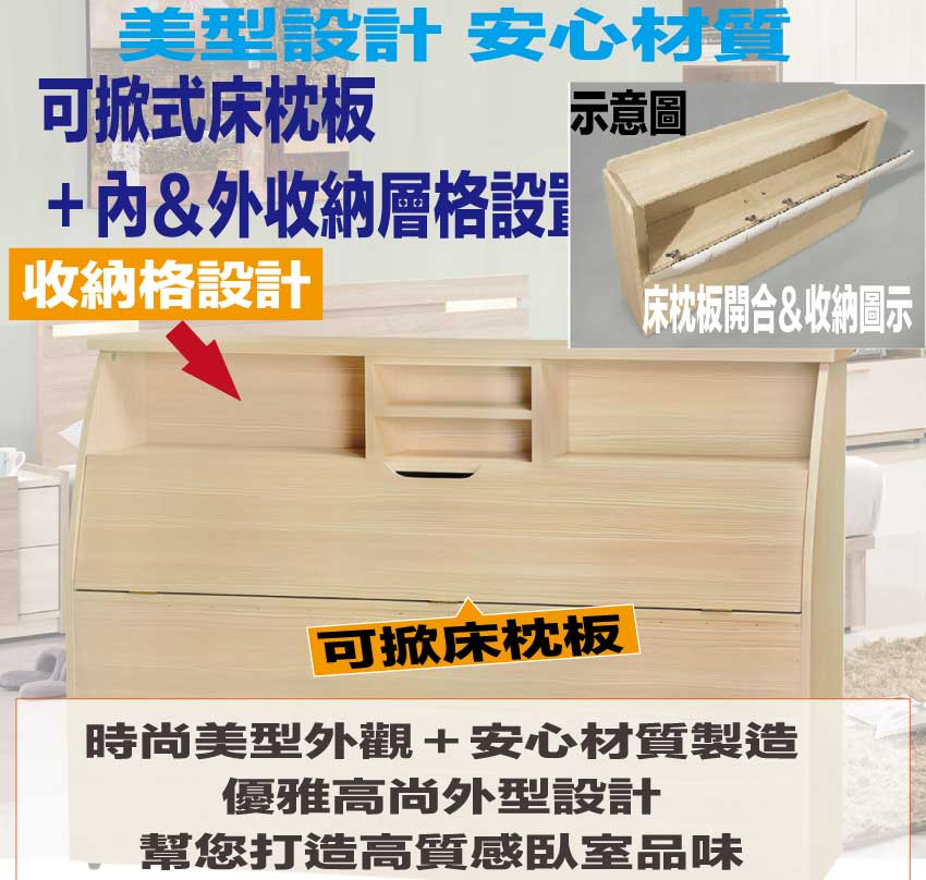 搭配床頭採用可掀式床枕板+內&外收納空間等收納空間設計