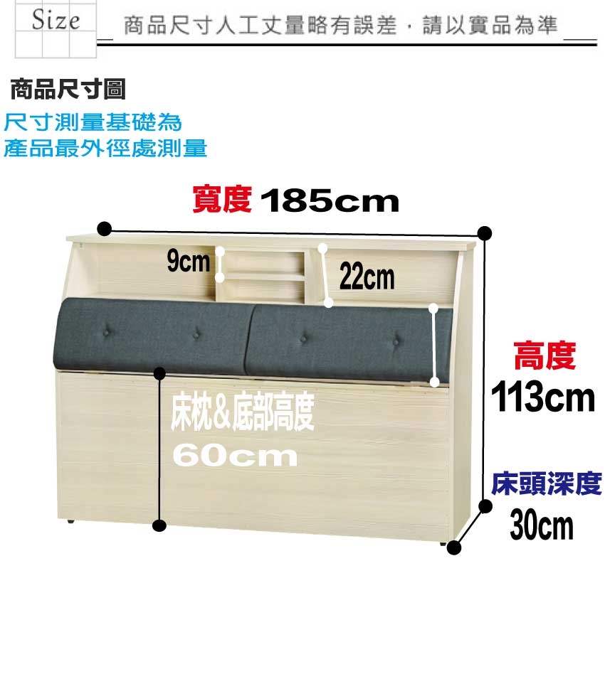 床頭尺寸:(寬)185x(深)30x(高)113/公分