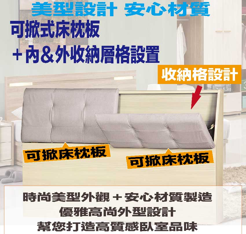 搭配床頭採用可掀式床枕板+內&外收納空間等收納空間設計