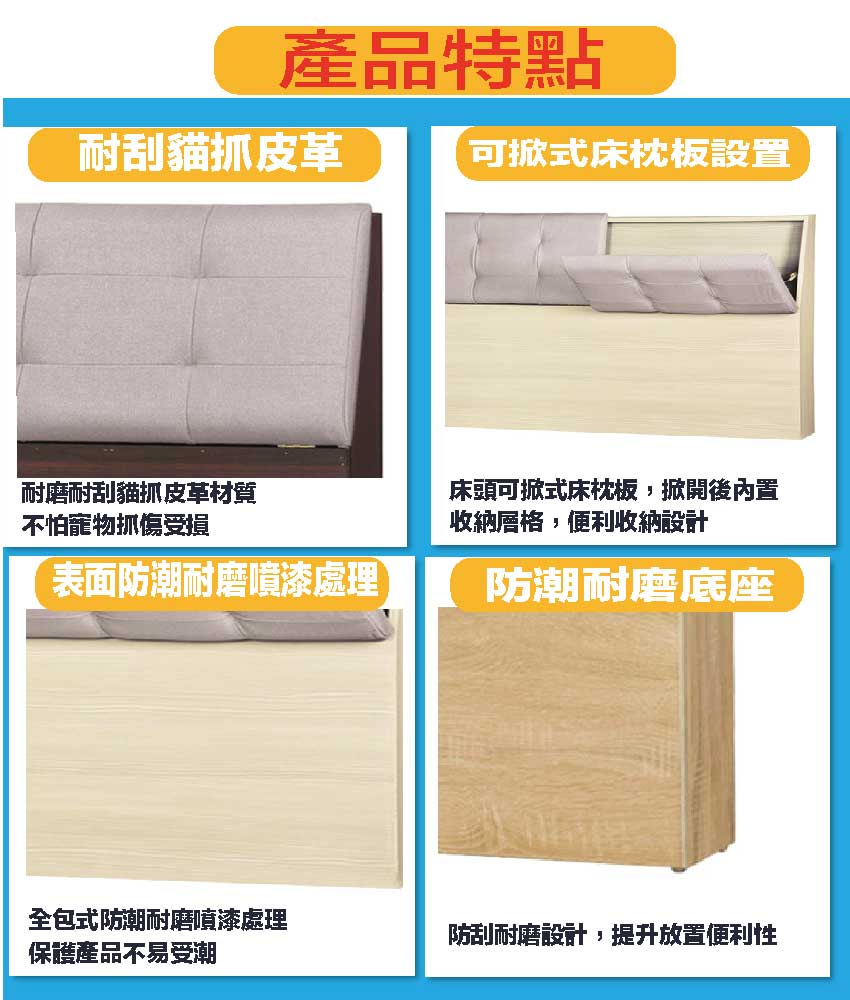 【綠家居】金陵5尺雙人貓抓皮革床頭箱(三色可選) 三色可選+安心材質製造,使用放心+搭配居家更便利,採用防蛀木心板+防潮耐磨底座+耐磨貓抓皮革+高回彈泡棉等安心材質製造 ,外層採用防潮耐磨噴漆處理搭配床頭採用可掀式床枕板+內&外收納空間等收納空間設計,全由專人配送到家,專業安心服務,替你省下更多時間!