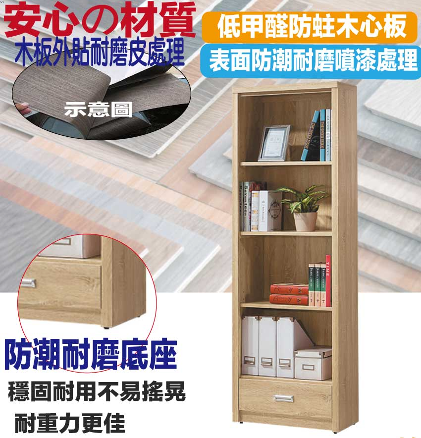 【綠家居】慕容2尺四格單抽開放書櫃(二色可選) 二色可選+安心材質製造,使用放心+搭配居家更便利,採用防蛀木心板+防潮耐磨底座等安心材質製造 ,外層採用防潮耐磨噴漆處理搭配採用單抽屜+開放多層格等收納空間設計,全由專人配送到家,專業安心服務,替你省下更多時間!