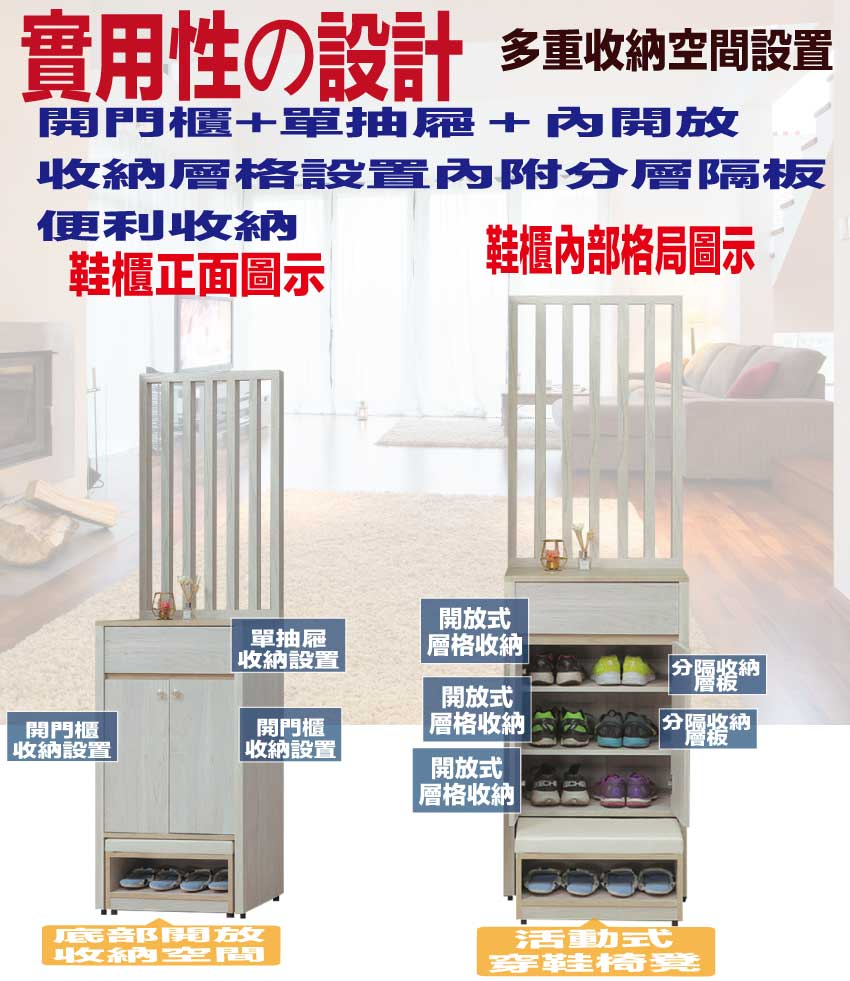 搭配採用開門櫃+單抽屜+內外開放層格搭配活動式座鞋椅凳等收納空間設計