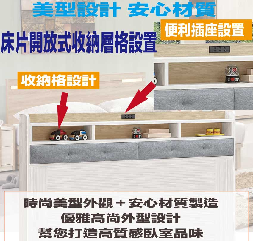 搭配床頭開放收納層格+便利插座設置等收納空間設計