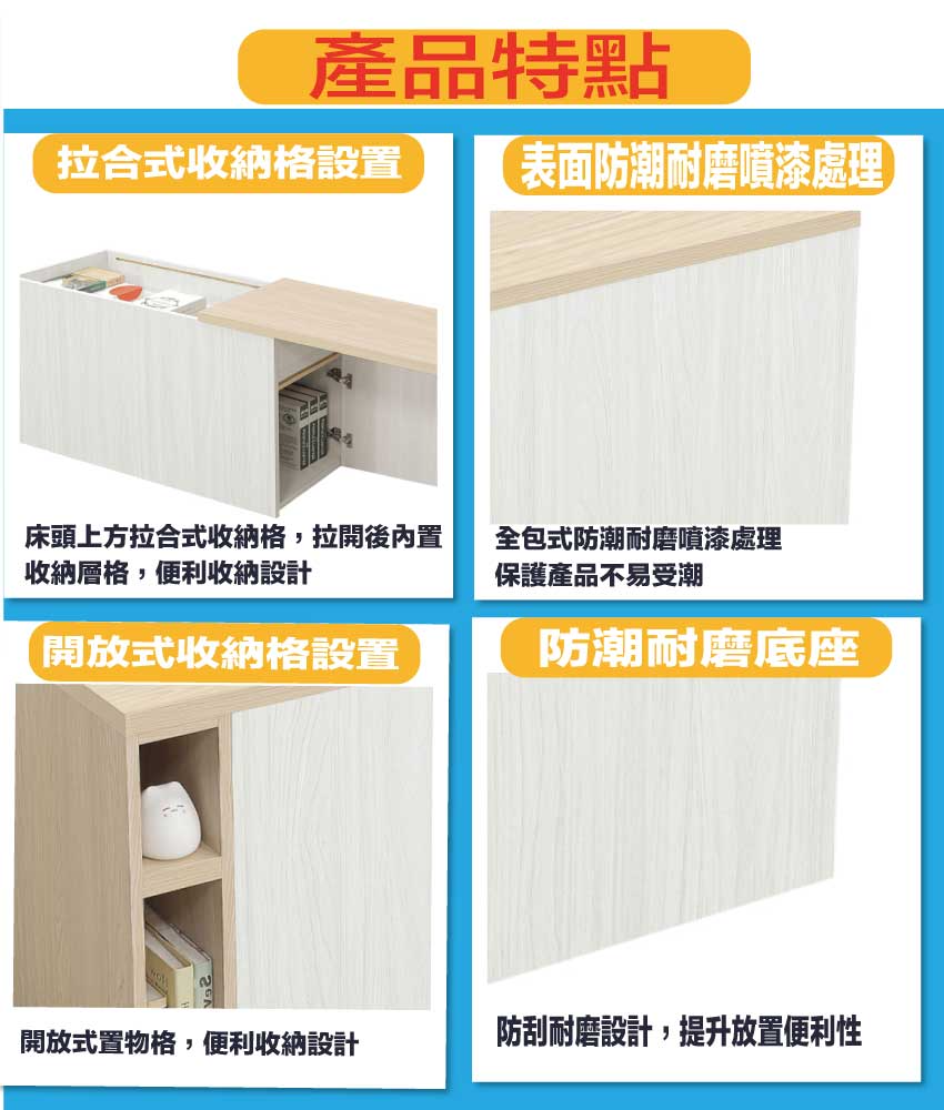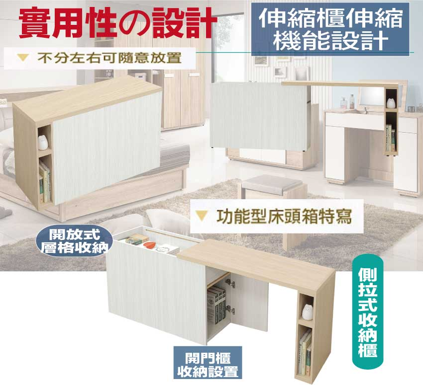 搭配採用可伸縮床頂板+內&外開放層格等收納空間設計
