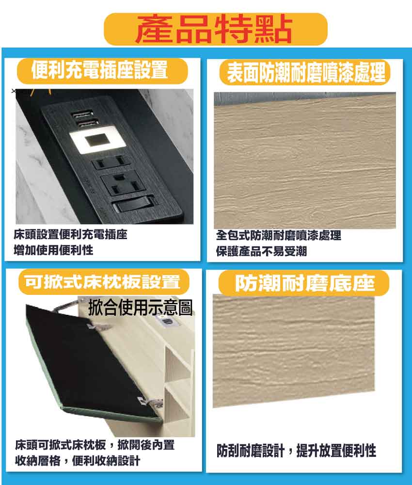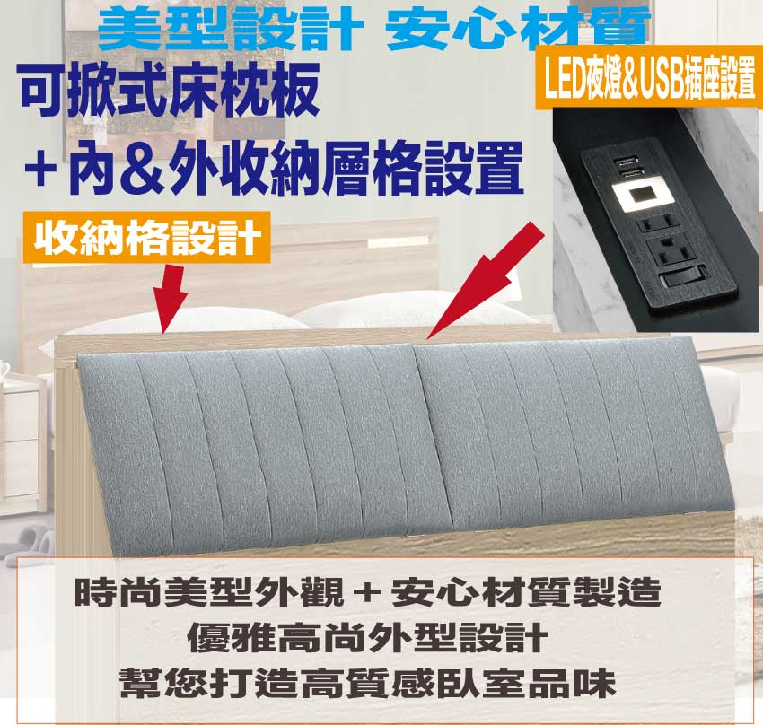 搭配床頭可掀式床枕板+內&外開放收納層格+便利插座設置等收納空間設計