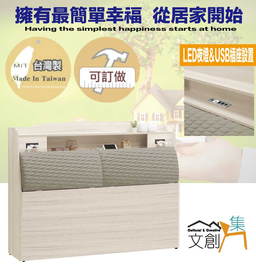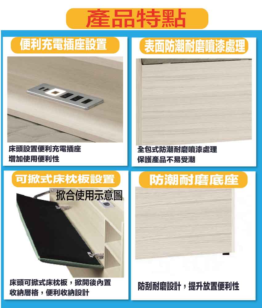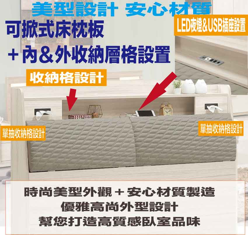 搭配床頭可掀式床枕板+內&外開放收納層格+LED夜燈&USB便利插座設置等收納空間設計