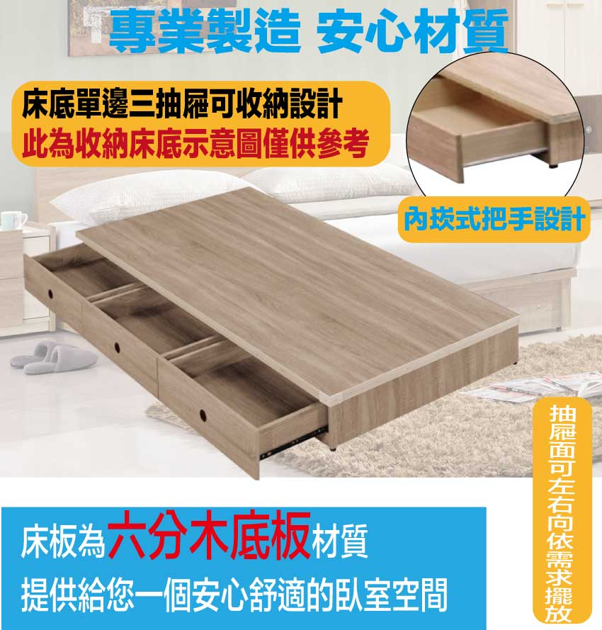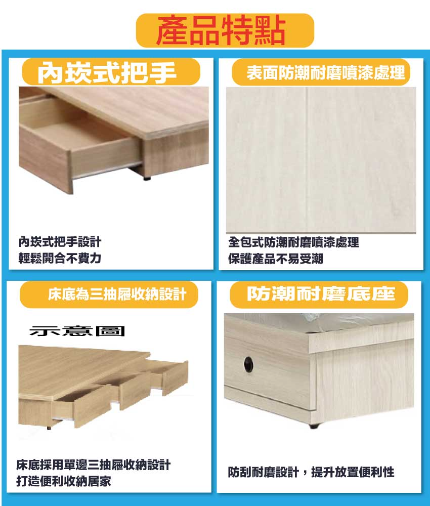 搭配床頭可掀式床枕板+內&外開放收納層格+LED夜燈&USB便利插座設置+床底座單邊開合三抽屜等收納空間設計