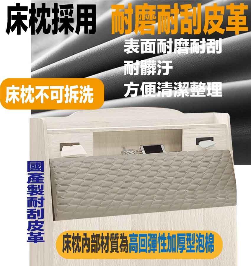 材質:防蛀木心板+六分木床板+防潮耐磨底座+耐磨耐刮皮革+高回彈泡棉