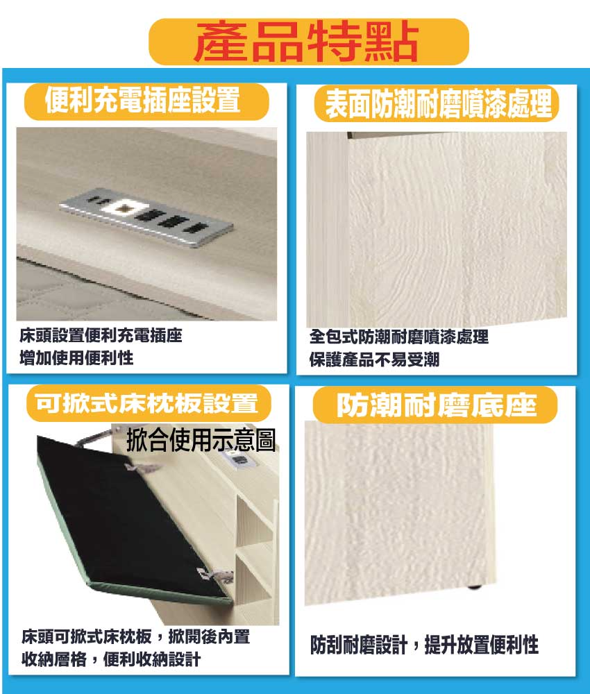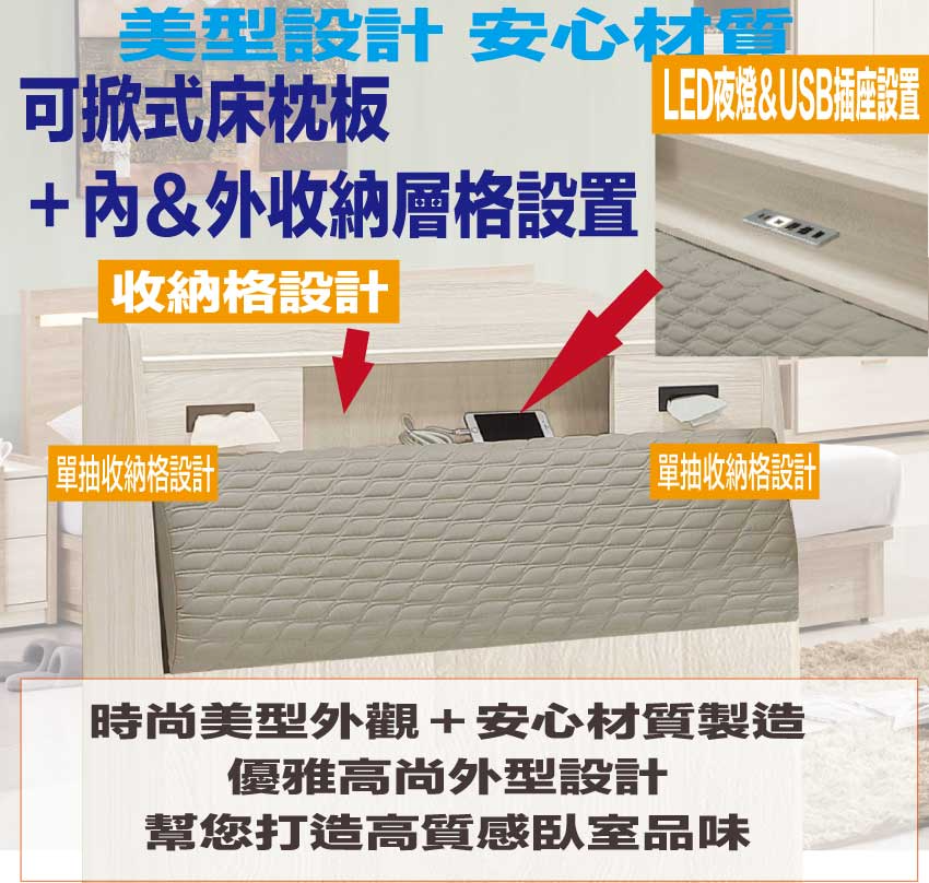 搭配床頭可掀式床枕板+內&外開放收納層格+LED夜燈&USB便利插座設置等收納空間設計