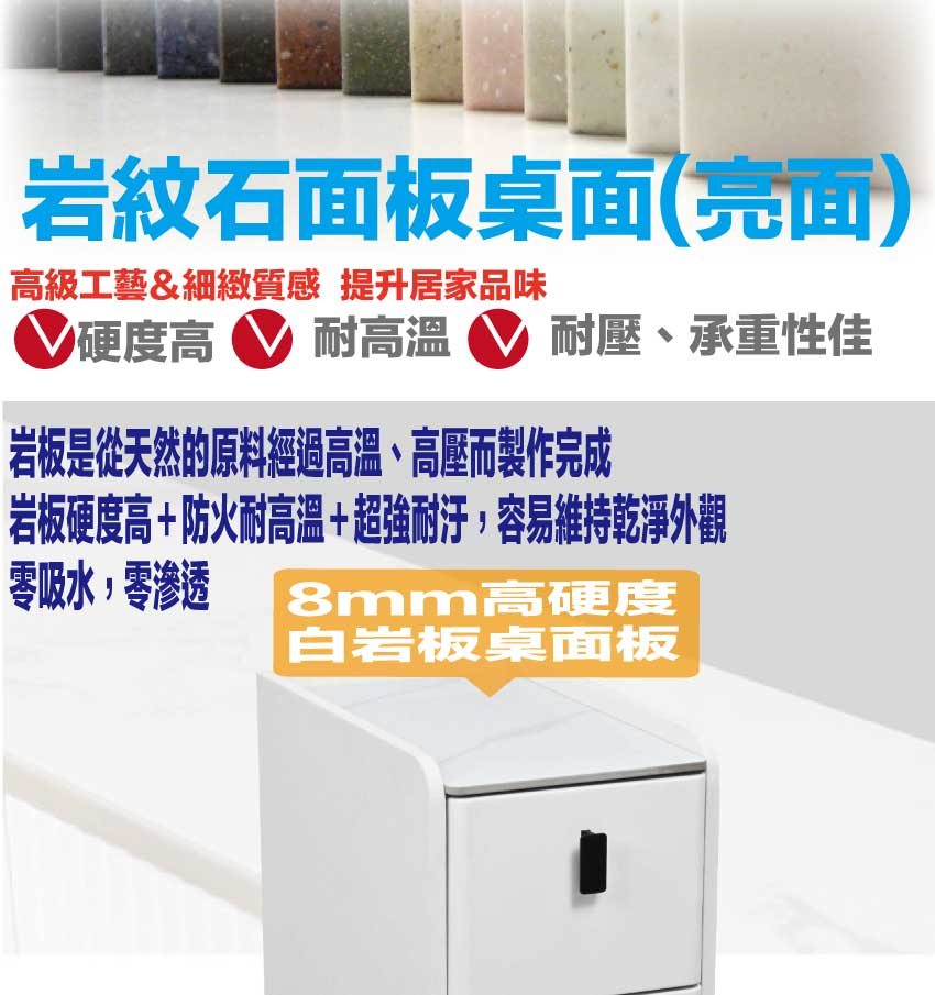 材質:防潮MDF板+烤漆鐵製腳座+五金滑軌結構+6mm高硬度岩板桌面板+透氣皮革外層包覆