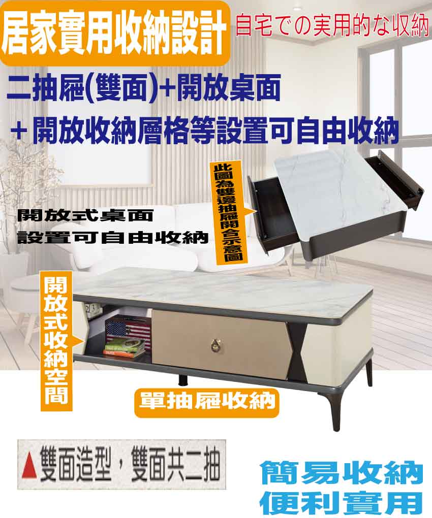 搭配採用雙面開合共二抽屜+開放層格等收納空間設計