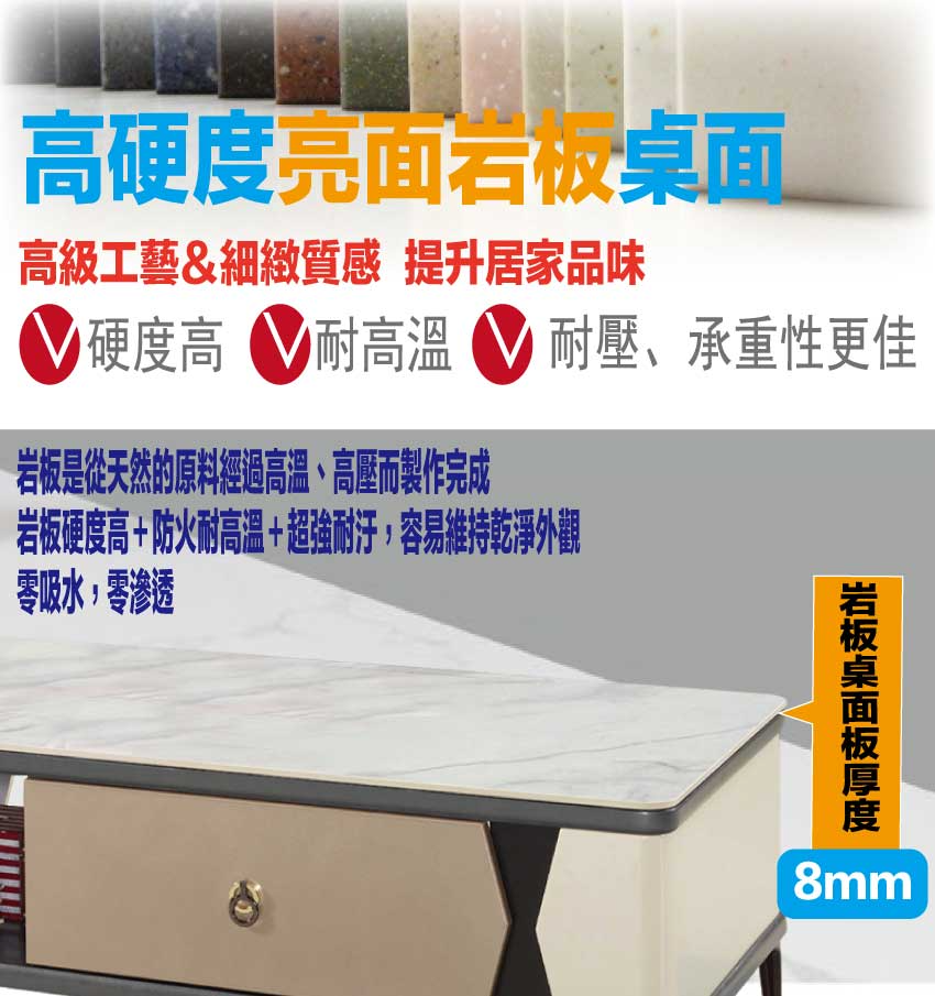 採用防潮MDF板+烤漆鐵製腳座+五金滑軌結構+8mm高硬度岩板桌面板等安心材質製造